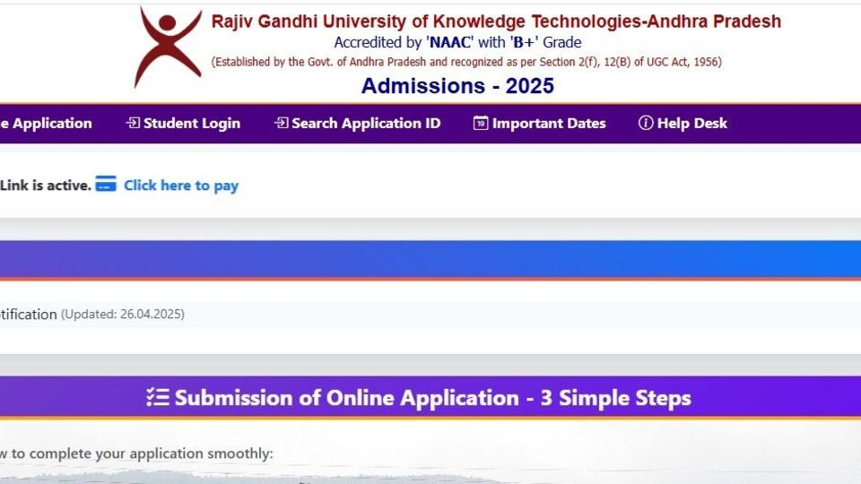 రాజీవ్ గాంధీ వైజ్ఞానిక సాంకేతిక విశ్వవిద్యాలయం పరిధిలోని నూజివీడు, ఒంగోలు, శ్రీకాకుళం, ఇడుపులపాయ IIITల్లో ప్రవేశాలకు నోటిఫికేషన్ విడుదలైంది. ఇందులో భాగంగా విద్యార్థుల నుంచి దరఖాస్తులను స్వీకరిస్తున్నారు. సెలెక్ట్ అయ్యే విద్యార్థులు ఆరేళ్ల ఇంటిగ్రేటెడ్ బీటెక్ కోర్సులో అడ్మిషన్లు పొందుతారు.