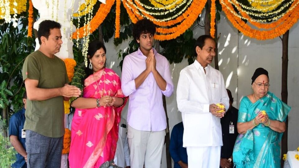 CM KCR Dasara Celebrations : హైదరాబాద్ లోని ప్రగతి భవన్ లో సోమవారం విజయదశమి వేడుకలు ఘనంగా జరిగాయి. దసరా పండుగను పురస్కరించుకుని ప్రగతి భవన్ లోని నల్ల పోచమ్మ అమ్మవారి దేవాలయంలో సీఎం కేసీఆర్ కుటుంబ సమేతంగా ప్రత్యేక పూజలు నిర్వహించారు. ఈ సందర్భంగా సీఎం కేసీఆర్ సతీమణి శోభమ్మ, కుమారుడు మంత్రి కేటీఆర్, కోడలు శైలిమ, మనుమడు హిమాన్షు పూజా కార్యక్రమంలో పాల్గొన్నారు. అనంతరం శమీపూజ నిర్వహించారు. ఇందులో భాగంగా సంప్రదాయ పద్ధతిలో జమ్మి చెట్టుకు ప్రత్యేక పూజలు నిర్వహించిన పూజారులు, విజయాలు సిద్ధించాలని ఆశీర్వచనం ఇచ్చారు.